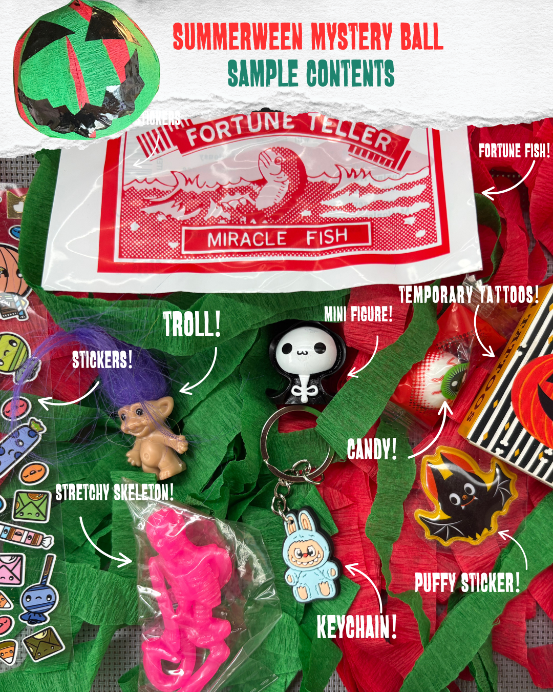 Sample contents include: Mini figure, Fortune Fish, Candy, keychain, Puffy Sticker, Enamel Pin, stretchy skeleton, temporary tattoos.