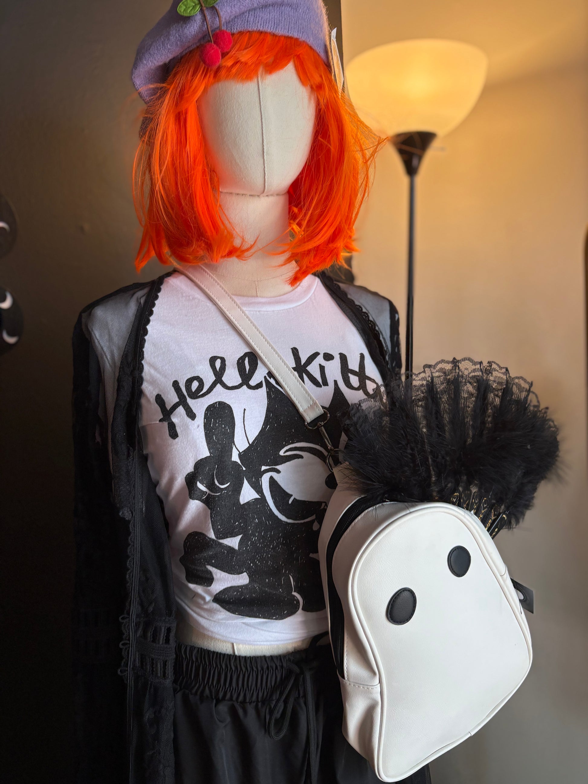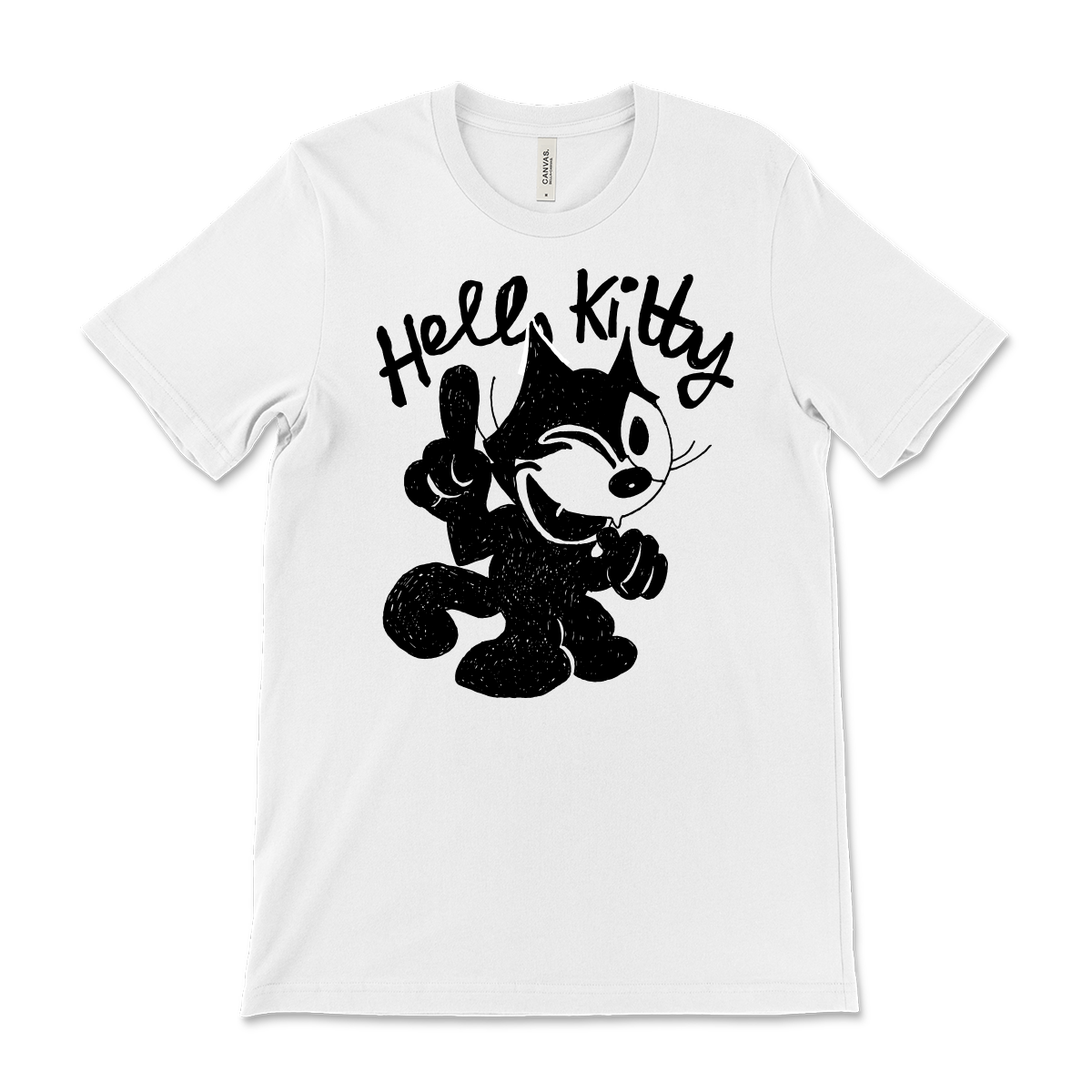 A combo of famous feline references make up this hand illustrated sassy shirt, for those who revel in rebellion with a sweet smile. You go, you Hell Kitty, you.