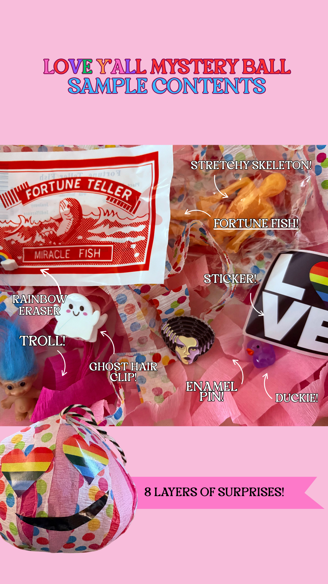 Unwrap eight layers of surprises in these handmade Pride Month Love Y'all Mystery Balls!
